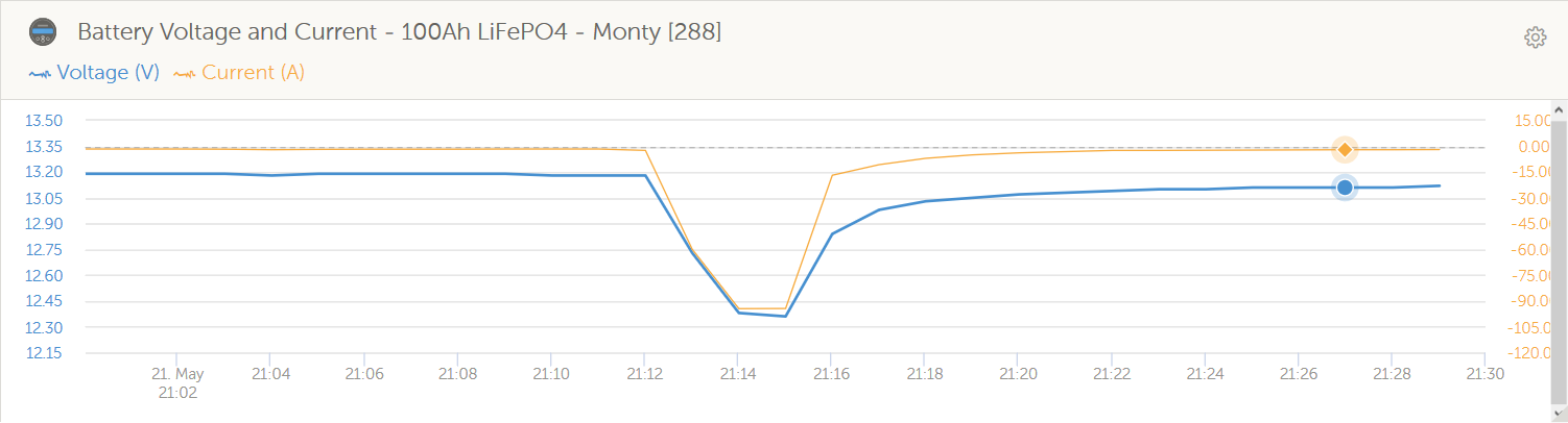 Can a battery using Pouch Cells deliver a high current? Here is a single 100Ah Battery fitted with Pouch Cells providing over 90A to help run a Microwave. That is 1168W (With Inverter losses).